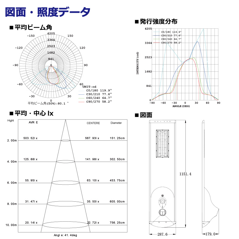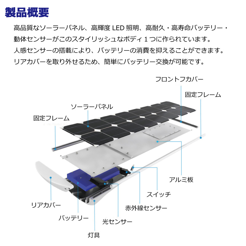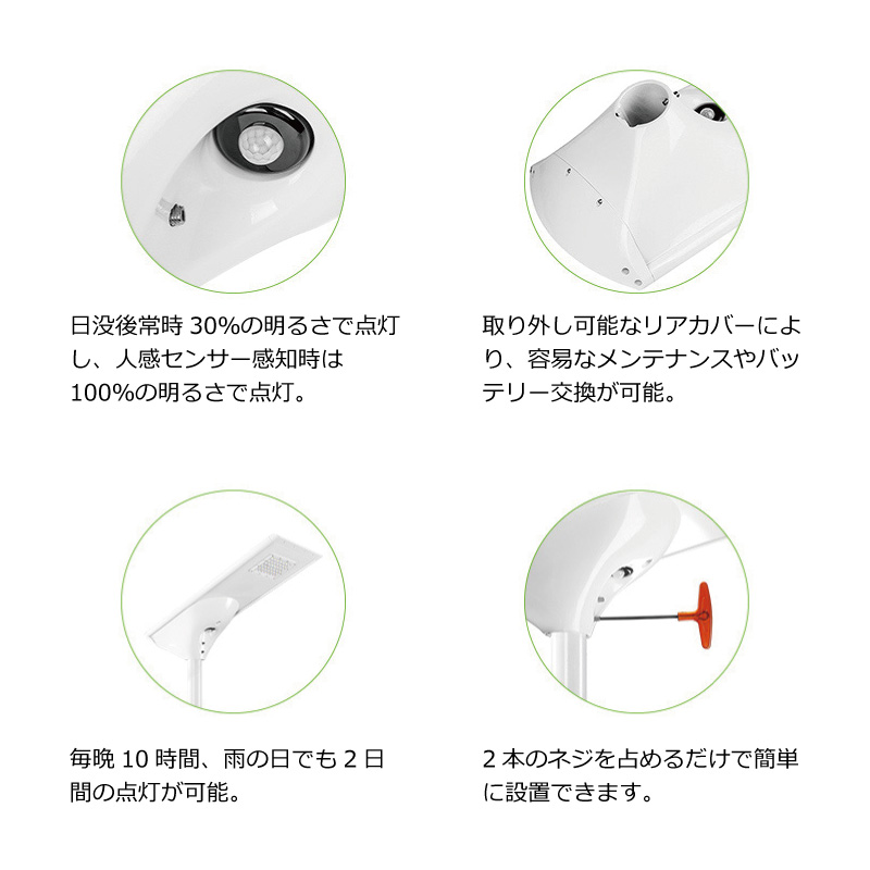| 日没後 | 常時 :30%(13.5W)の明るさで点灯 人感センサー感知時 :100%(45w)の明るさで点灯 |