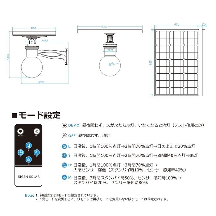 | U | 日没後100%1時間→70%3時間→人感センサー稼働(スタンバイ時10%、センサー稼働時50%)→40%夜明けまで |