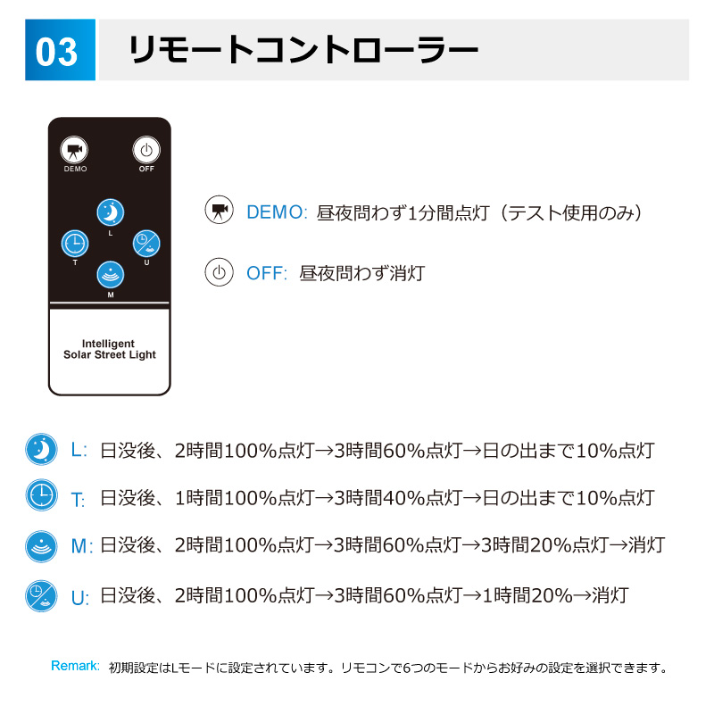 | L | 日没後100%2時間→60%3時間→夜明けまで10%点灯(推奨モード) |